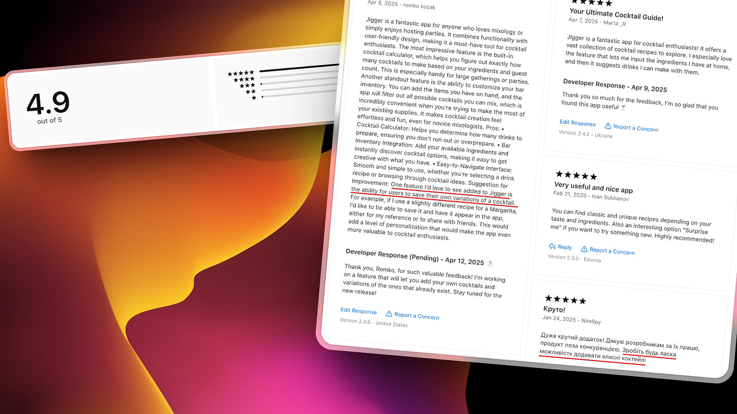 Additionally, I'll share how I’ve been employing AI tools to accelerate development and build smarter solutions, including a recent experiment that enabled me to create a complete admin panel in just a couple of evenings. I’ll also provide a sneak peek at one of the most requested features coming to Jigger—custom cocktail recipes—and how I’m working to make it a reality.